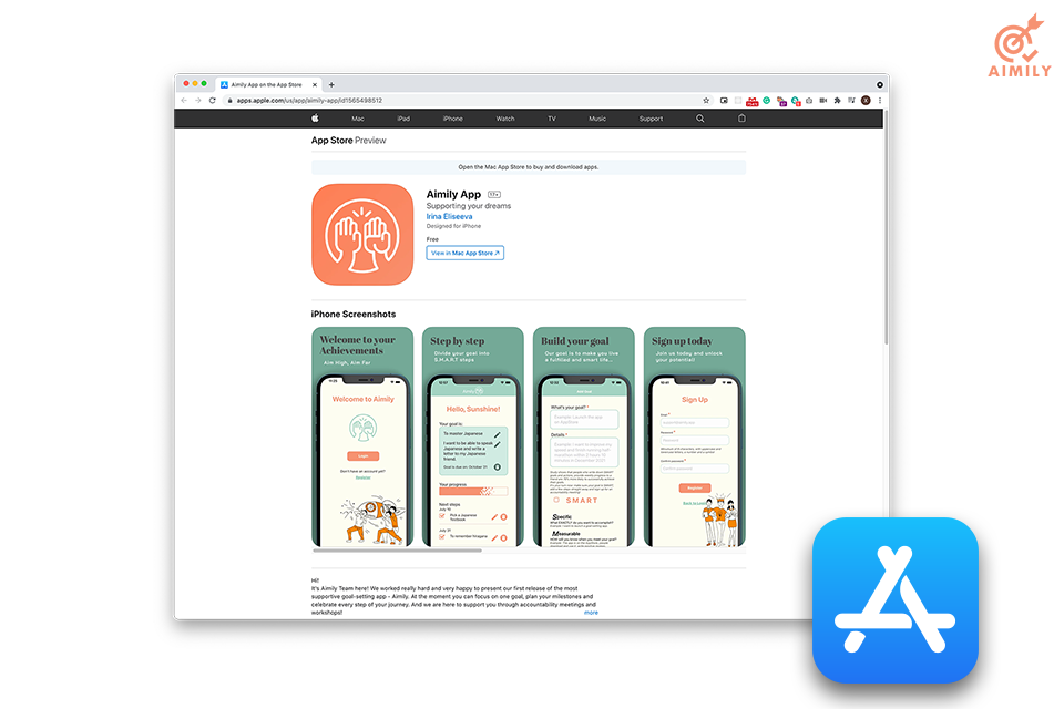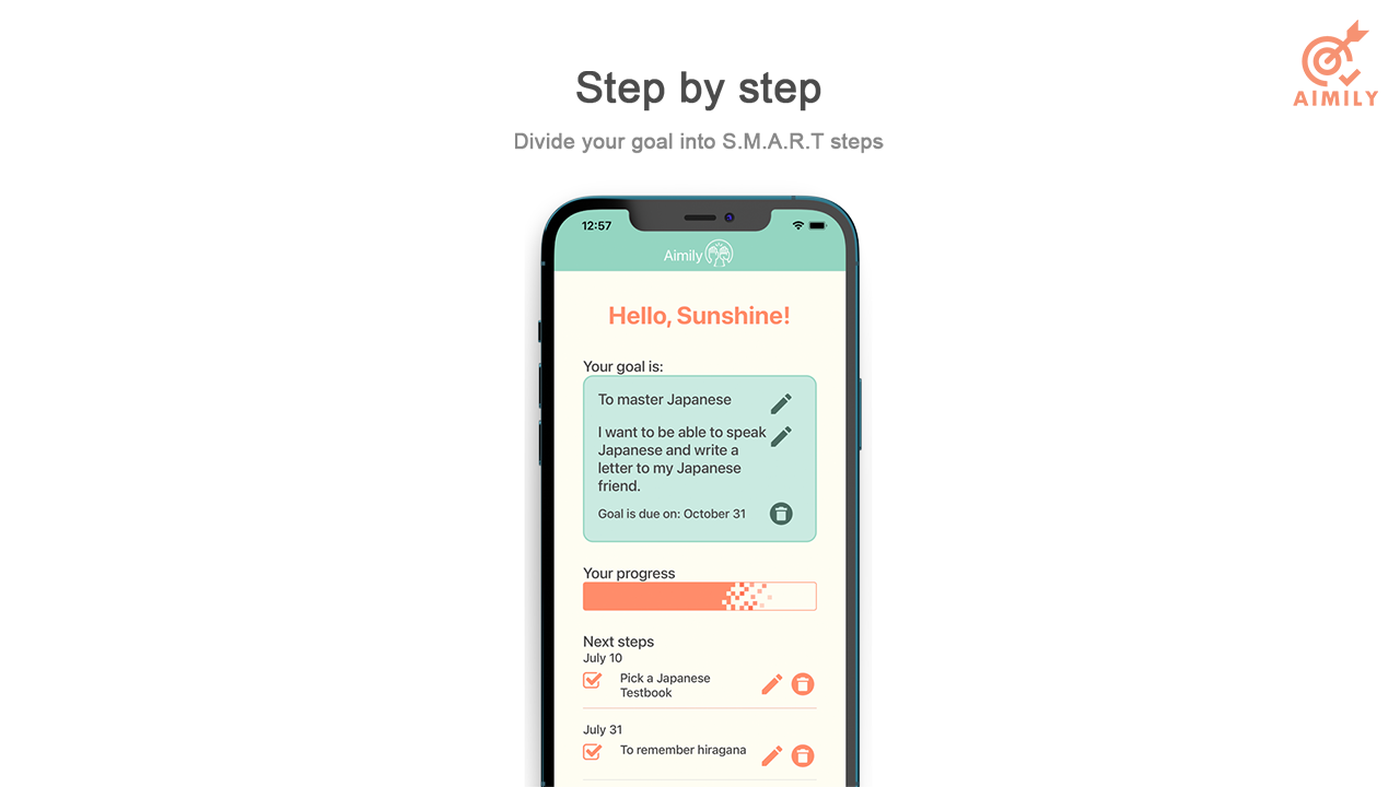Aimily is a SMART goal-setting app that allows users to break down one task into multiple steps. It reminds users to follow the SMART goal principles (meaning specific, measurable, attainable, relevant, and time-bound) throughout the task breakdown process. I am currently working as a front-end designer in Team Aimily. My teammate and I have implemented a goal view screen that visually displays the progress of task completion. I am also in charge of the App Store and Play Store designs for the App as well as the upcoming blog page for Aimily web application.